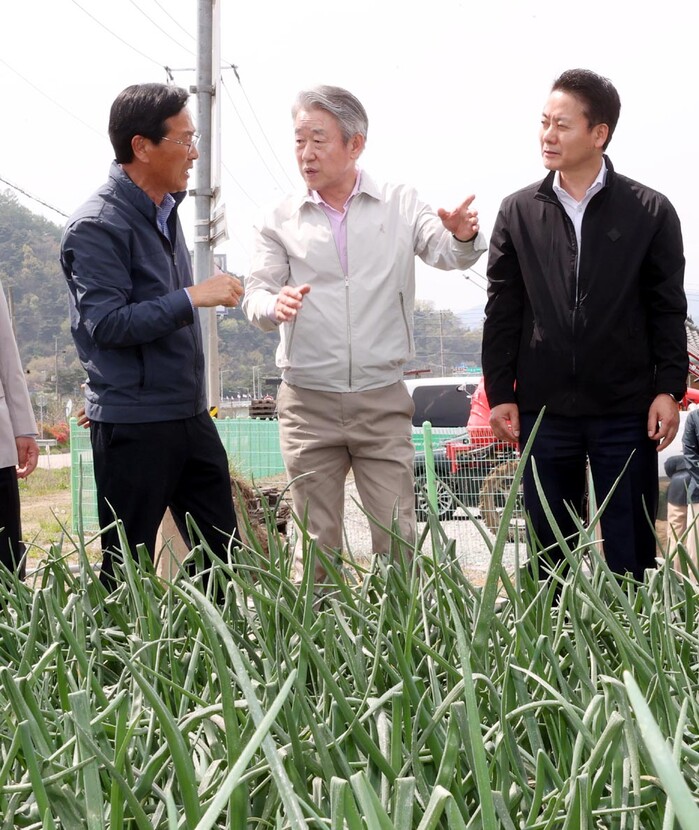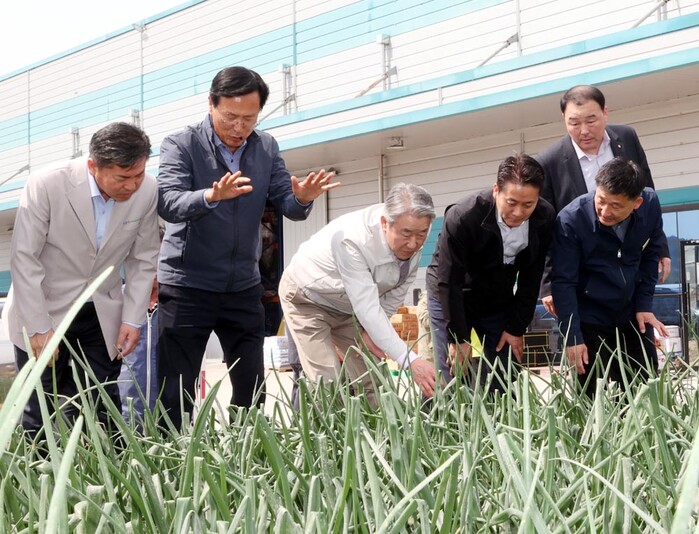▲12일 생육상황 점검을 위해 경남 함양군 양파 농가를 방문한 강호동 농협중앙회장(사진 가운데)이 관계자들과 이야기를 나누고 있다. |