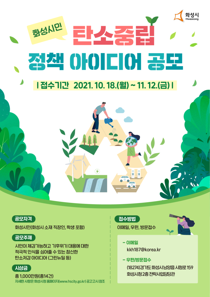 [로컬세계 고용주 기자]경기 화성시는 시민과 함께 기후위기에 대한 공감대를 형성하고 참신한 탄소저감 사업을 발굴하기 위한 ‘화성시민 탄소중립 정책 아이디어 공모전’을 개최한다고 18일 밝혔다.