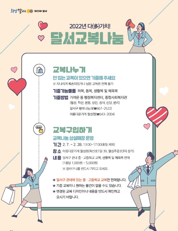 [로컬세계 박세환 기자]대구 달서구는 안 입는 교복을 기증 받아 저렴한 가격으로 판매해 학부모들의 경제적 부담을 덜어주고, 그 수익금으로 저소득 가정 신입생 입학준비금을 지원하고자 '2022년 달서교복나눔'상설매장을 2월 말까지 운영한다.