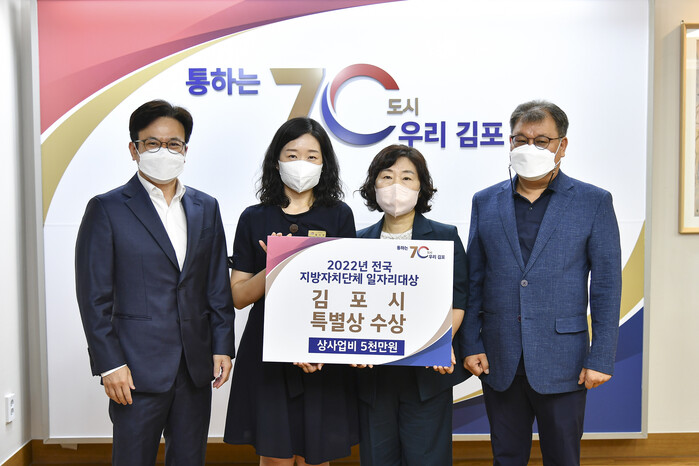 [로컬세계=김병민 기자]경기 김포시가 지난 21일 정부세종컨벤션센터에서 개최된 ‘2022년 전국 지방자치단체 일자리대상’에서 일자리 공시제 부문 ‘특별상’을 수상하고 5000만원의 상사업비를 확보했다.