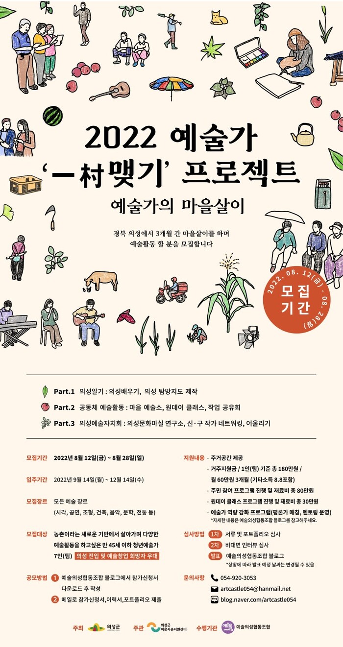 예술가 일촌 맺기 프로젝트 4기는 오는 9월부터 12월까지 의성군 관내 단위마을에서 추진하며 의성과 청년예술가를 이어주고, 의성의 자원을 활용한 다양한 예술 활동을 통해 청년예술가가 의성에서 지역 예술가로 성장할 수 있도록 지원하는 사업이다.