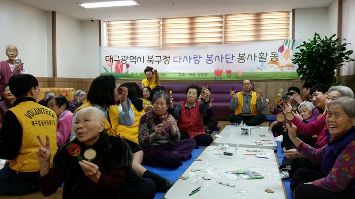 이날 다사랑봉사단은 어르신들과 함께 손거울, 컵 받침대 만들기 및 건강 안마 운동프로그램을 실시해 시설어르신들이 생활에 필요한 용품을 직접 만들 수 있는 뜻 깊고 색다른 시간을 가졌다.