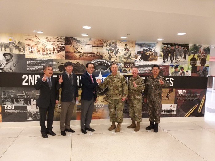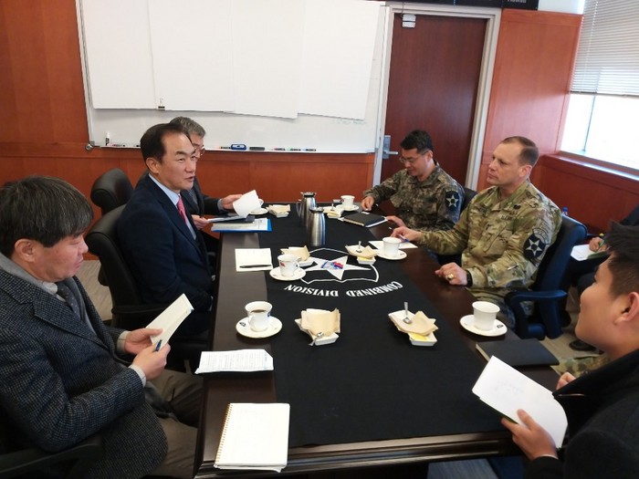 | ▲지난 16일 험프리내 미2사단 사령부를 방문한 정장선 평택시장은 맥킨 사단장과 한미간 교류 확대 방안을 논의했다.(평택시 제공) |