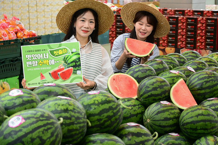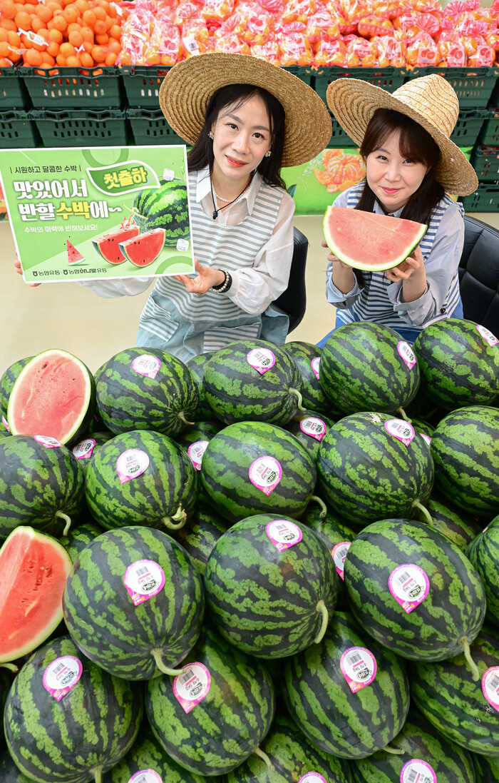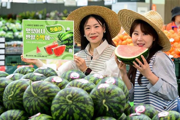 ▲ 11일 서울 서초구 농협 하나로마트 양재점에서 모델들이 처음 출하된 봄 수박을 소개하고 있다. 농협유통 제공 |