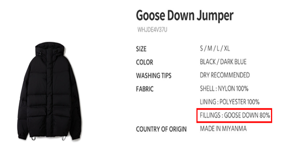 현행 기준에 따르면 전체 충전재 중 솜털이 75% 이상이면 ‘다운 제품’으로 표기할 수 있고, 거위털 제품은 거위털이 80% 이상이어야 한다. 충전재가 부위별로 다를 경우에는 각각 구분 표시해야 한다.