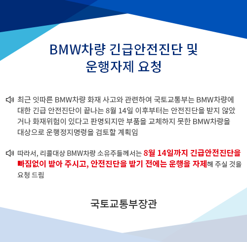 국토부 관계자는 “이번 사건은 국민 전체의 안전에 영향을 미칠 수 있으므로 리콜 대상 BMW 소유주들이 긴급 안전진단 및 리콜 조치를 조속히 이행하길 바란다”고 강력히 당부했다.