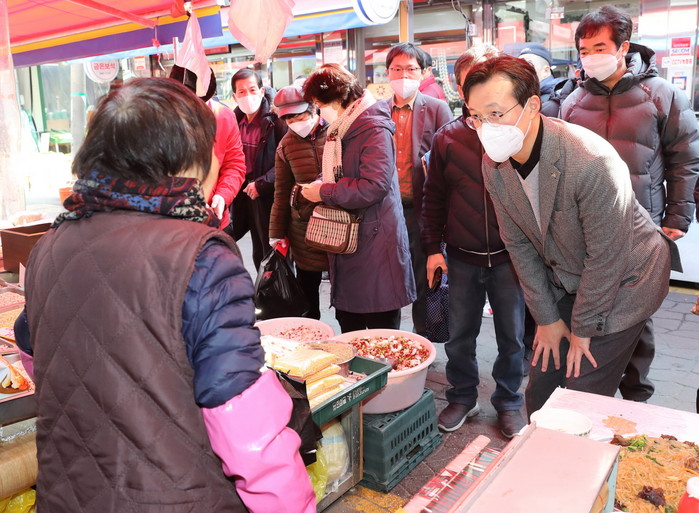 ▲채현일 구청장이 8일 대림중앙시장을 찾아 시장 상황을 점검하고 어려움과 고충을 들었다.(영등포구청 제공) |