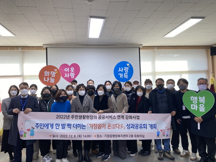 [로컬세계 부산=맹화찬 기자]부산 기장군(군수 정종복)은 지난 8일 기장읍 행정복지센터(읍장 김제열)에서 기장읍 지역사회보장협의체와 함께 「주민에게 한 발 짝 더하는 ‘기장읍이 온다’」 ‘사업성과 공유회’를 개최하였다고 밝혔다.