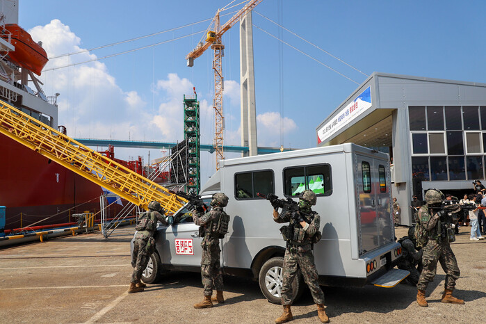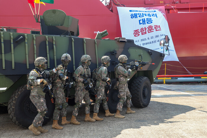 [로컬세계 부산=김의준 기자]육군 제53보병사단은 22일 UFS연습(Ulchi Freedom Shield, 을지 자유의 방패연습)의 일환으로 울산광역시장 등 유관기관장들이 참석한 가운데 현대미포조선 일대에서 해양테러 대응 및 고도화된 북한 핵·미사일 공격에 대비한 훈련을 실시했다.