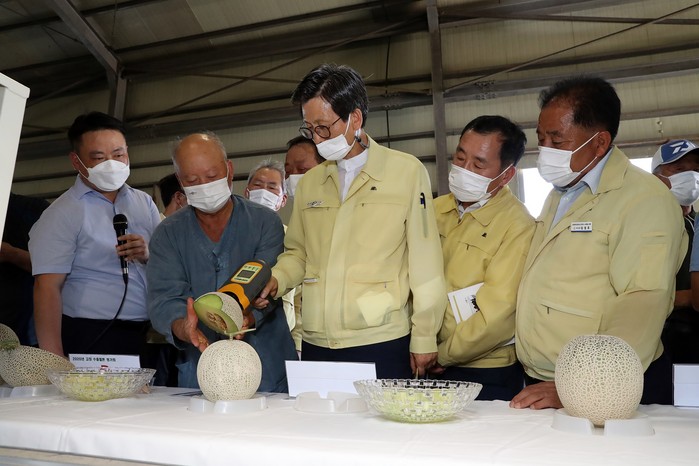 ▲유기상 군수가 고창멜론의 당도를 측정하고 있다.(고창군 제공) |