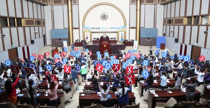 | ▲제8회 경기도의회 청소년의회교실에 참여한 청소년들이 찬반의사를 표시하고 있다. |