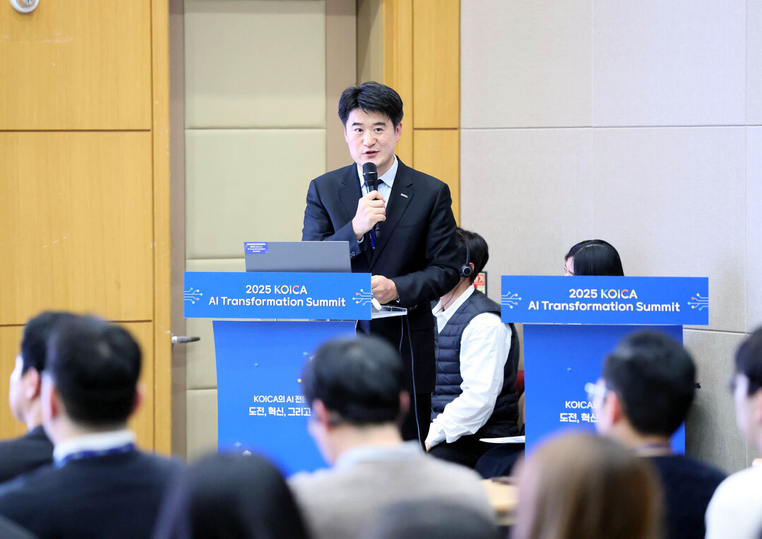 15일 오후 경기도 성남시 코이카 본부에서 열린 ‘2025년 코이카 AX 역량강화 성과공유회’에서 조현규 인공지능전환실장이 AI 활용 종합 성과를 발표하고 있다.