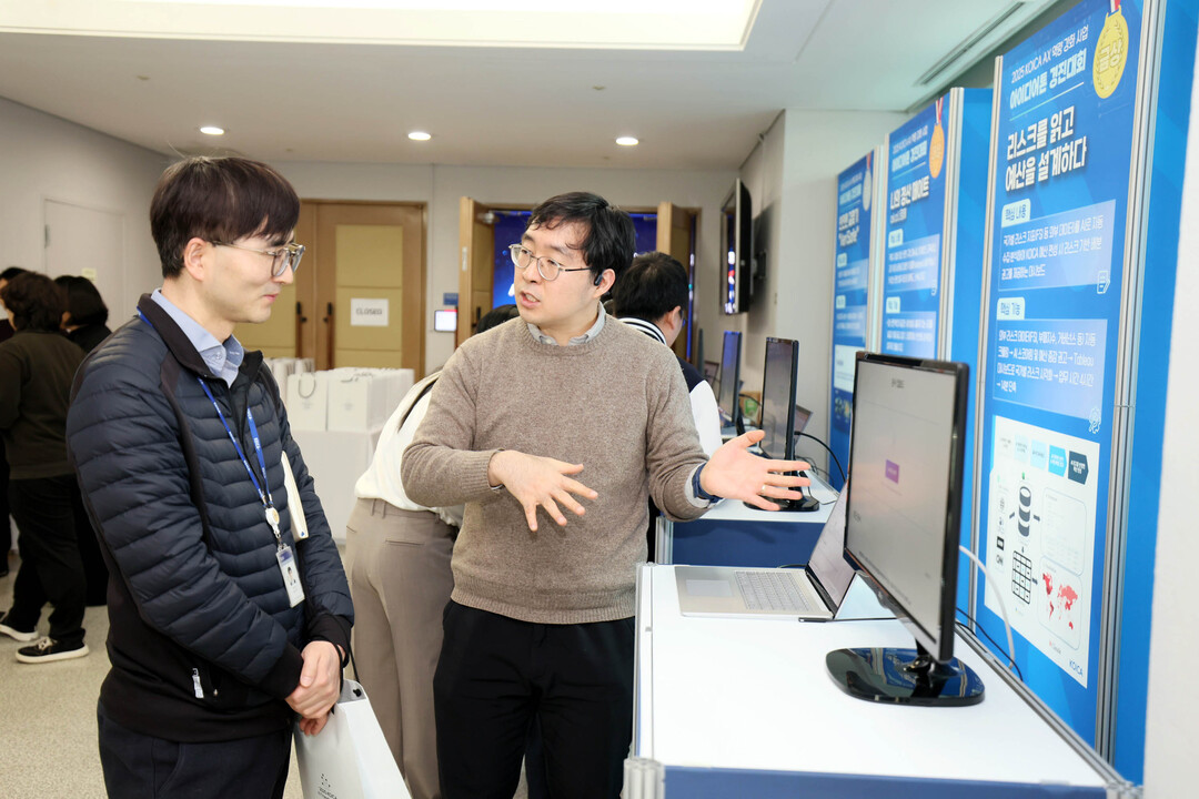 15일 오후 경기도 성남시 코이카 본부에서 열린 ‘2025년 코이카 AX 역량강화 성과공유회’에서 ‘AI 아이디어톤 경진대회’ 우수작 수상자들이 직원들에게 AI를 활용한 업무 아이디어를 소개하고 있다.