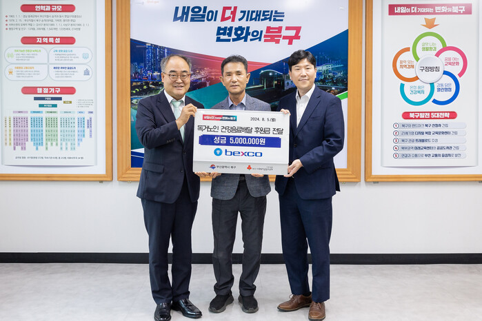[로컬세계 부산=맹화찬 기자]부산 북구청은 지난 5일 ㈜벡스코에서 구청을 방문해 ‘독거노인 사랑의 건강음료 배달사업’에 사용해 달라며 후원금 500만원을 전달했다고 7일 밝혔다.