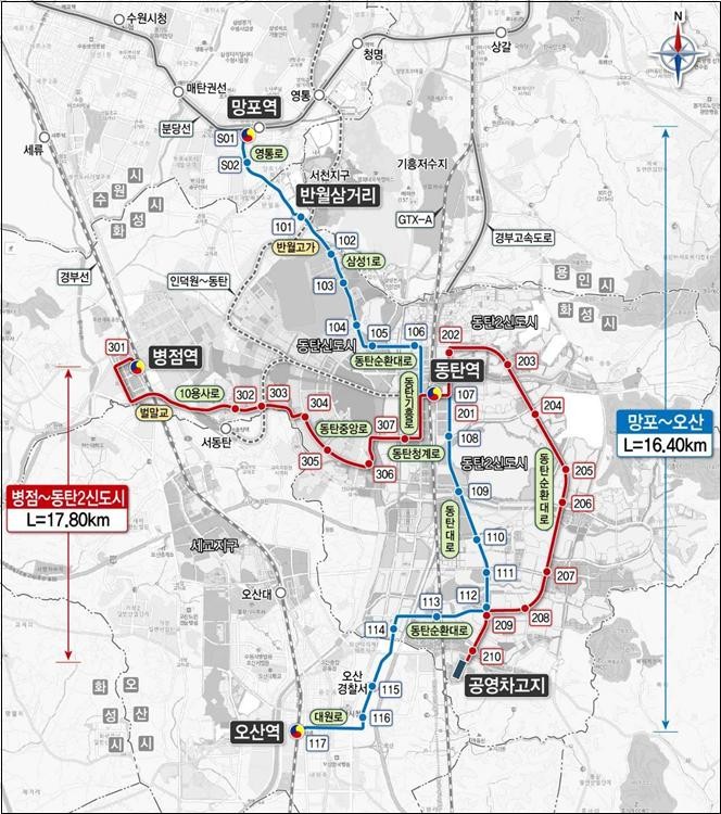 총 사업비 9773억원이 투입되며 오산~동탄~수원 망포 3개 시를 하나로 연결하는 노선과 병점역에서~동탄 2신도시를 연결하는 총 2개 노선 36개 정거장으로 확정됐다.