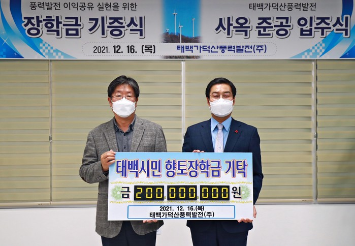 [로컬세계 박상진 기자]가덕산풍력발전주식회사(대표 권오철)는 16일 가덕산풍력발전 관리사무실 신축사옥에서 지역의 풍력발전사업 개발이익 환원을 위해 태백시에 장학금 2억 원을 기탁하며 기부 1호 발전사로 이름을 올렸다.