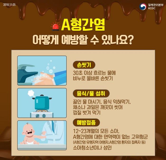 특히 위생환경이 개선된 1970년대 이후 출생한 30~40대는 어릴 때 A형 간염 바이러스에 대한 항체가 제대로 형성되지 않아 A형 간염 예방을 위한 주의가 필요하다. 또 백신을 맞지 않은 12~23개월 소아, A형 간염에 대한 면역력이 없는 고위험군 소아·청소년·성인은 백신접종을 하는 것이 좋다.