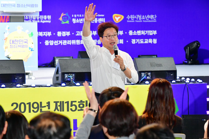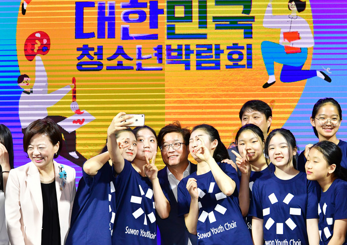‘2019 다시 청소년이다!’를 주제로 25일까지 수원컨벤션센터에서 열리는 청소년박람회는 수원시, 여성가족부, 경기도가 공동주최한다. 개막식은 진선미 여성가족부장관 개회사, 염태영 시장 환영사로 시작해 ‘청소년 미래 선언’ 발표, 축하 공연으로 이어졌다.