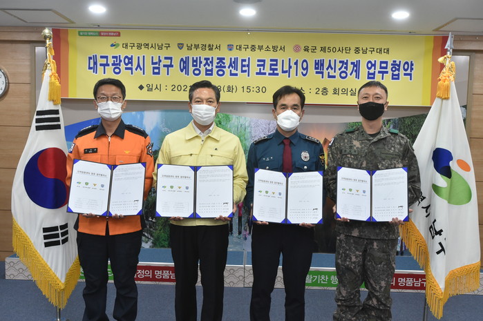 [로컬세계 박세환 기자]대구 남구청은 13일 군, 경찰, 소방서와 코로나19 예방접종센터 방호 업무를 위한 협약을 체결했다고 밝혔다.