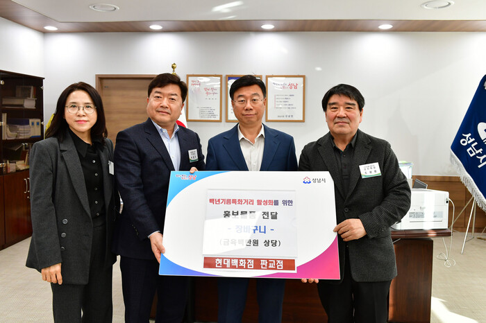 시는 1월 16일 오후 시장 집무실에서 신상진 성남시장과 곽창환 현대백화점 판교점 부점장, 조광용 모란전통기름시장 상인회장, 김순한 소상공인시장진흥공단 성남센터장 등이 참석한 가운데 ‘백년기름특화거리 활성화를 위한 홍보 물품 전달식’을 했다.