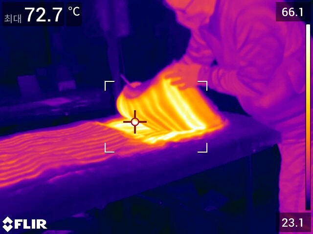 이번 실험은 소방재난본부와 협업하여 가정에서 사용하는 동일한 세트로 제작하여 실시하였고 전기장판 위에 1시간 동안 올려진 극세사 이불에서는 온도가 72도까지 상승하여 화재위험이 있는 것을 확인했다.