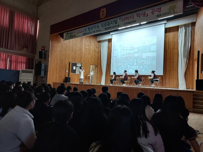 [로컬세계=정판주 기자]경남 창원특례시(시장 홍남표)는 18일 반림중학교에서 전교생 500여명을 대상으로 2022년 찾아가는 진로뮤지컬 공연 ‘어쩌다 학생’을 개최했다고 밝혔다.