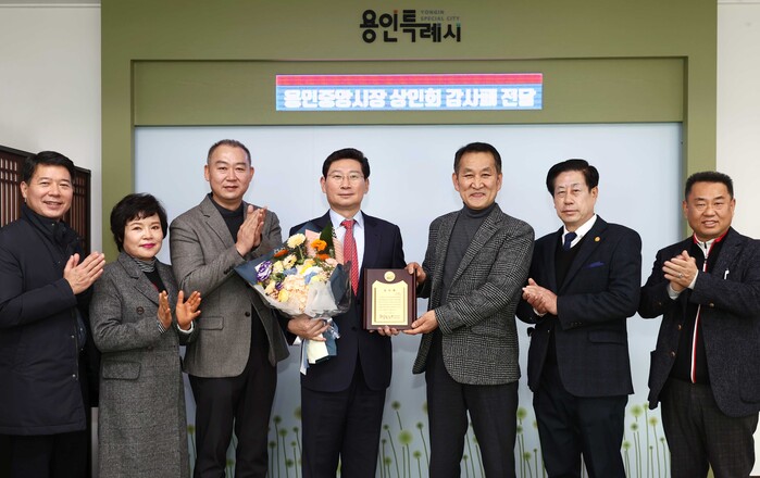 ▲ 이상일 용인특례시장이 26일 처인구 김량장동 용인중앙시장 상인회로부터 국토교통부 도시재생사업 대상지 선정 공로로 감사패를 받았다. 용인특례시 제공 |