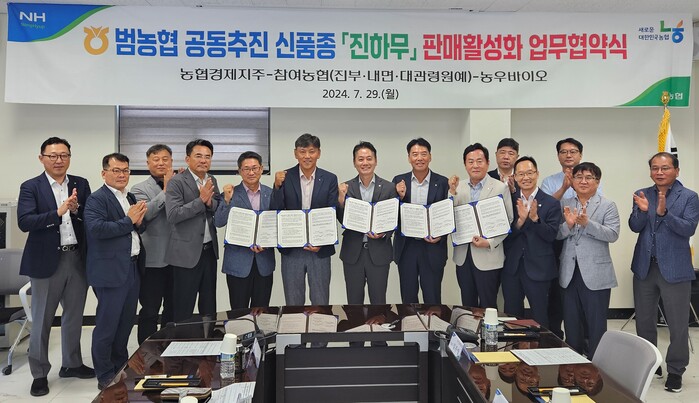 농협경제지주가 29일 강원도 평창에서 진부농협, 내면농협, 대관령원예농협, 농우바이오와 여름무 신품종 ‘진하무’ 판매 활성화를 위한 업무협약(MOU)을 체결했다.