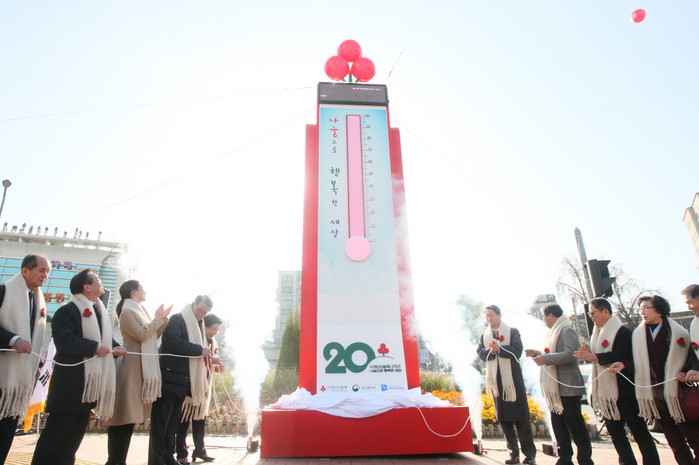 사랑의 온도탑은 모금 목표액의 1%의 성금이 모금될 때 마다 온도가 1도씩 올라가는 구조물로 이를 통해 모금액 및 모금현황을 확인할 수 있다.