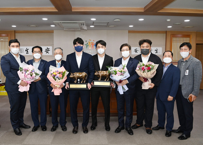 [로컬세계 김병민 기자]경기 수원시청 씨름선수단이 2021 추석장사씨름대회 태백·금강장사 우승 트로피를 수원시에 봉납(捧納)했다.