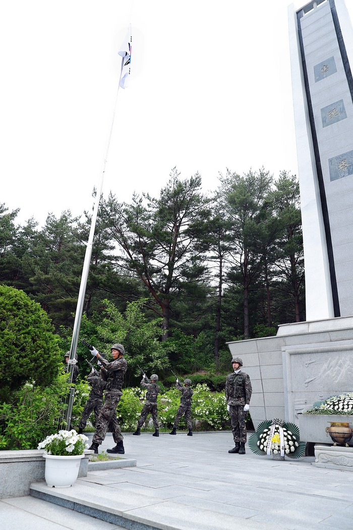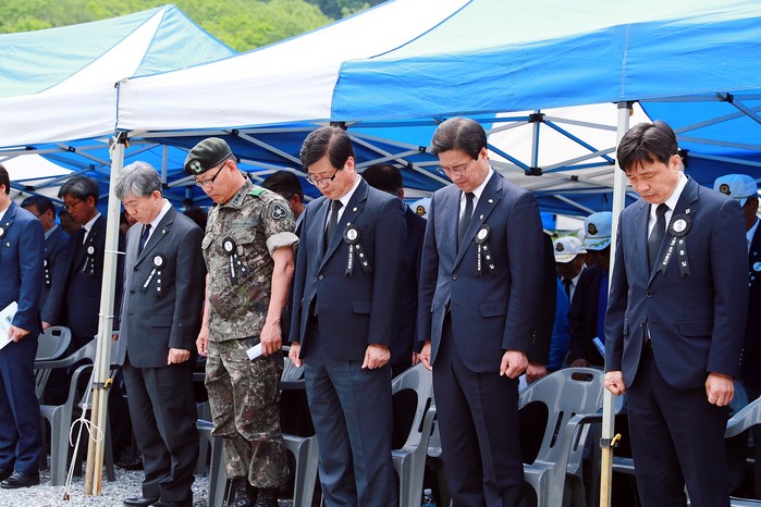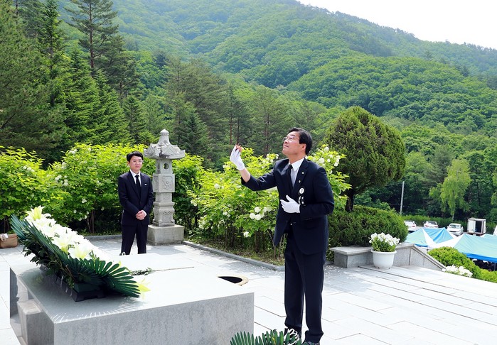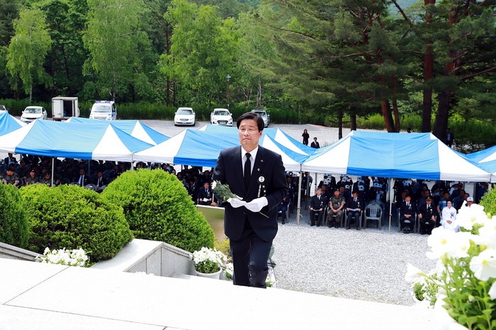 류태호 태백시장이 6일 오전 9시 50분 연화산 충혼탑에서 국가 유공자와 유족, 보훈단체, 군인, 기관·단체장 등 900여 명이 참석한 가운데 열린 제64회 현충일 추념식에서 국가를 위해 헌신·희생한 순국선열 및 호국영령의 고귀한 넋을 기리고 있다.(사진=태백시 제공)