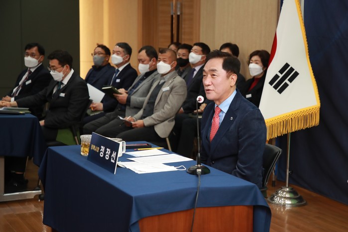 | ▲정장선 평택시장이 '2022 임인년(壬寅年) 권역별 비대면 신년 인사회'에서 신년사를 하고 있다. 평택시 제공 |