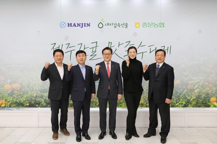 ▲ 26일 서울시 중구 한진빌딩 본관에서 열린 ㈜한진-중문농협 제주감귤 소비촉진행사에서 참석자들이 기념촬영을 하고 있다. 사진 왼쪽부터 변대근 농협중앙회 상호금융사업지원본부장, 노삼석 ㈜한진 대표이사, 이재식 농협중앙회 부회장, 조현민 ㈜한진 사장, 김성범 중문농협 조합장. 농협 제공 |