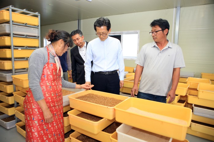 ▲유기상 군수가 무장면 황금터영농조합법인 방문해 애로사항을 듣고 있다. |
