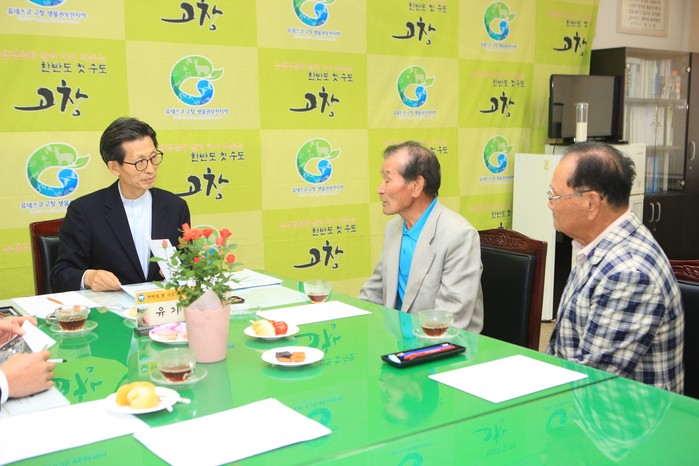 ▲유기상 군수가 22일 무장면을 찾아 민원인들을 만나고 있다.(고창군 제공) |