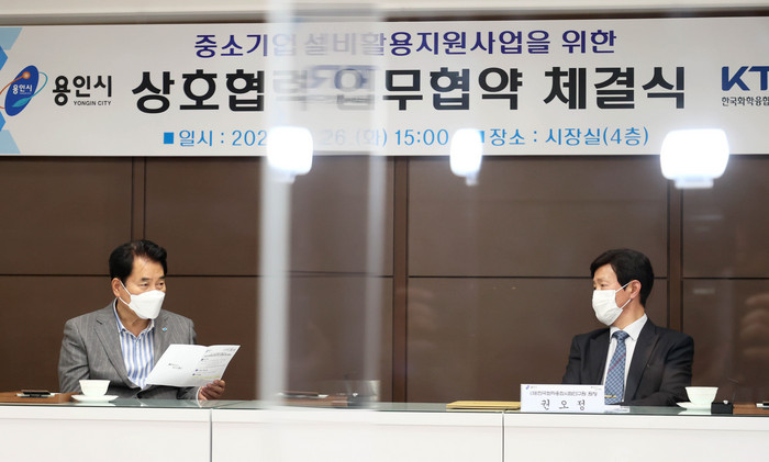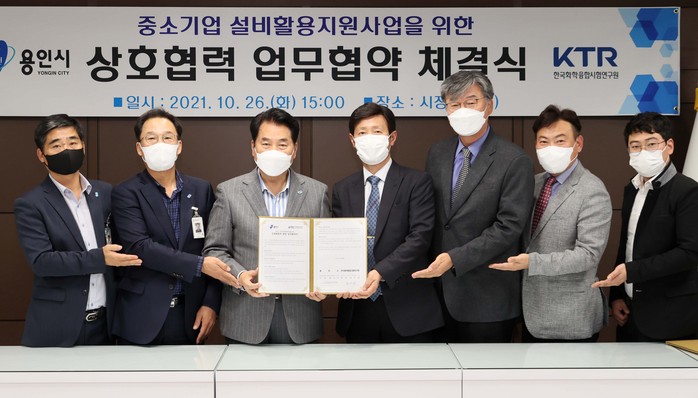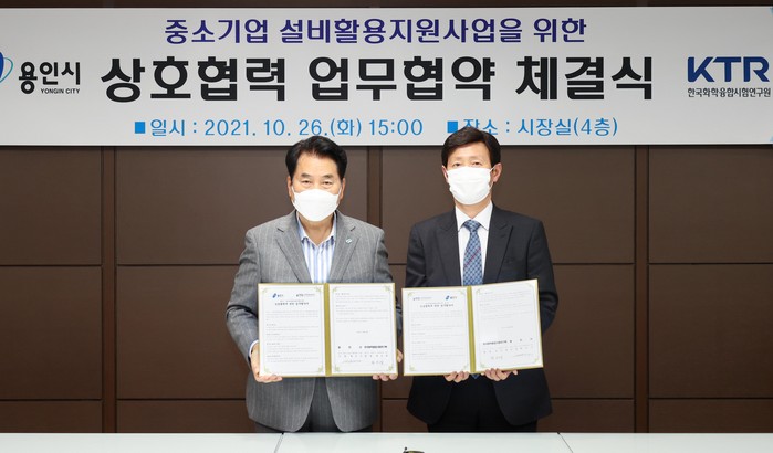 용인시는 26일 시청 시장 집무실에서 (재)한국화학융합시험연구원(KTR)과 관내 중소기업에 고가의 시험 장비를 무료 지원하는 내용의 업무협약을 체결했다.
