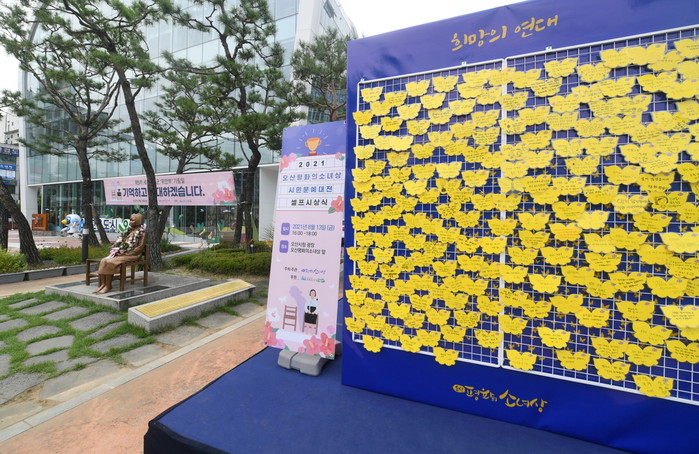 [로컬세계 김병민 기자]오산평화의소녀상은 평화의소녀상의 의미와 역사를 되짚어보고, 코로나로 힘든 시대에 희망메시지를 담은 나비엽서를 부착한 전시벽을 오산시청 광장의 평화의소녀상 옆에 설치하고 13일부터 31일까지 전시할 예정이다.