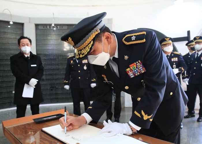▲남해해양경찰청장이 신년(계묘년)을 맞아 부산중앙공원 충혼탑을 찾아 헌화하고,순국선열과 호국영령의 위훈을 기렸다. |