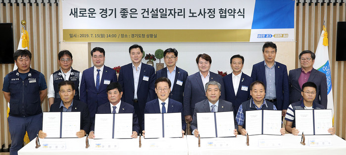 이재명 경기도지사는 15일 오후 경기도청 상황실에서 송한준 경기도의회의장, 김용목 한국노총 경기지역본부의장, 변문수 민주노총 전국건설노조 수도권남부지역본부장, 하용환 대한건설협회 경기도회장, 최용근 대한전문건설협회 경기도회 부회장과 ‘새로운 경기 좋은 건설일자리 노사정 협약’에 서명했다.