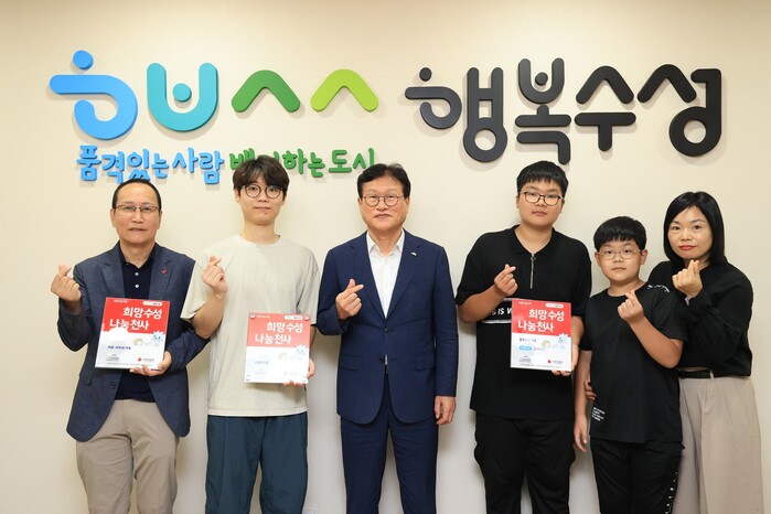 김대권 수성구청장은 “어려움이 계속되는 시기에도 이렇게 이웃사랑에 선뜻 마음을 더해주신 분들께 감사와 존경을 표한다”며, “기부해주신 분들의 마음이 잘 전달될 수 있도록 우리 이웃을 위해 성금을 소중하게 사용하겠다”고 말했다.