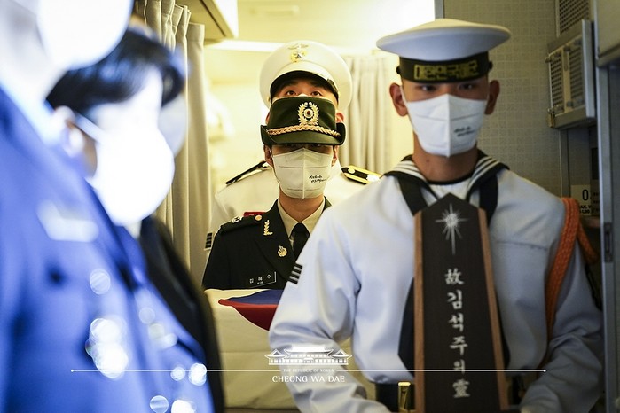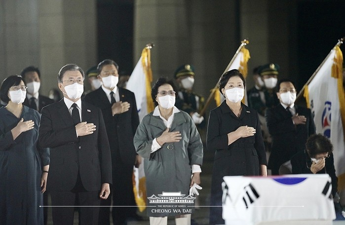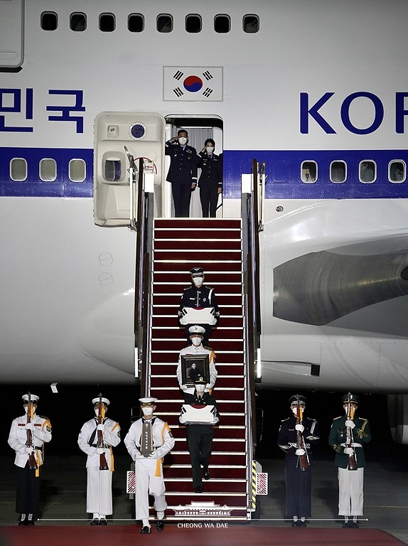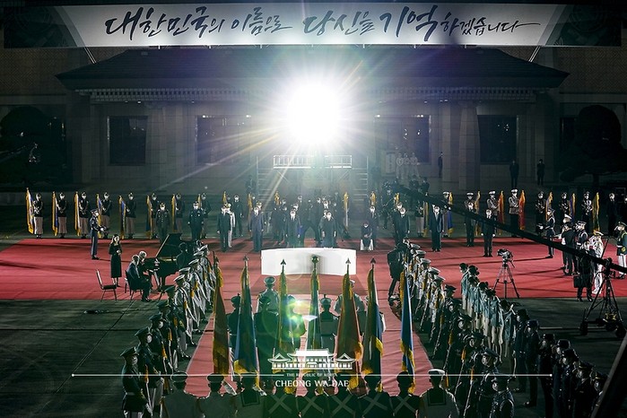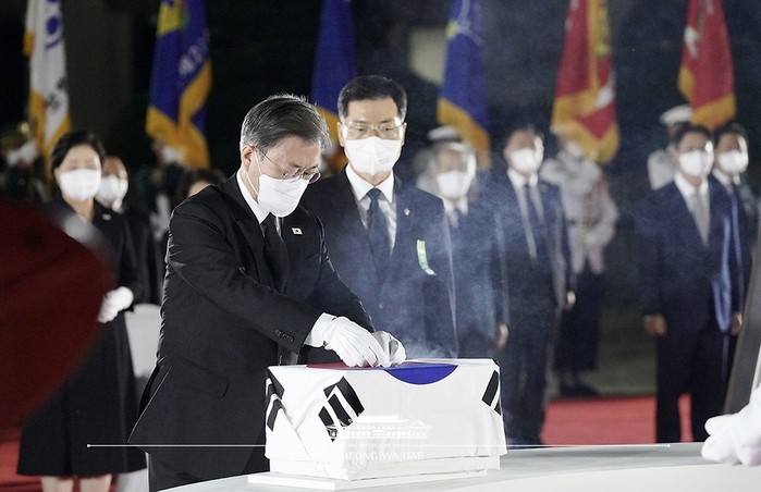 정부는 23일 밤 9시 30분 서울공항에서 문 대통령이 참석한 가운데 ‘대한민국의 이름으로 당신을 기억하겠습니다’라는 주제로 ‘국군 전사자 유해 봉환식’을 거행했다.(사진=청와대)
