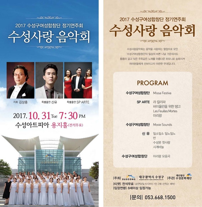 이번 음악회에는 수성구의 홍보대사이자 지역 출신의 부자(父子)트로트 가수로 유명한 신유씨가 특별 출연해 일소일소 일노일노, 반, 수성못 첫사랑, 시계바늘을 들려준다. 또 피아노, 바이올린, 퍼커션, 장구의 흔치않은 조합으로 구성된 에스피아르떼(SP ARTE)는 클래식, 재즈, 국악퓨전, 현대음악 등을 아우르는 폭 넓은 연주로 감동과 재미를 자아낸다.