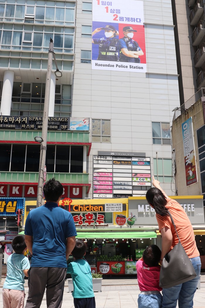 [로컬세계 맹화찬 기자]부산해운대경찰서는 해운대구 구남로 소재 고층빌딩 외벽을 이용해 남녀경찰관을 모델로 한 대형 랩핑작업을 완료했다고 5일 밝혔다.