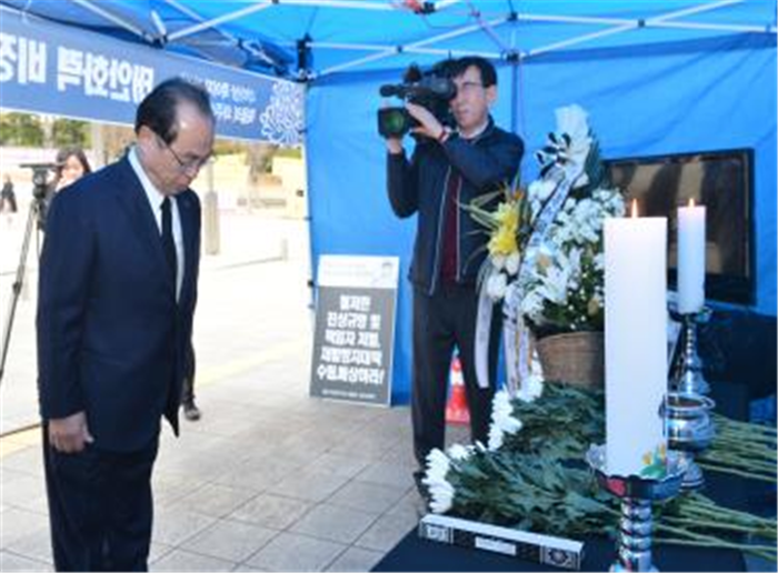 | ▲21일 부산시청 앞 광장에 마련된 故 김용균 노동자의 분향소를 찾은 오거돈 부산시장이 깊은 애도를 표하고 있다.(부산시 제공) |