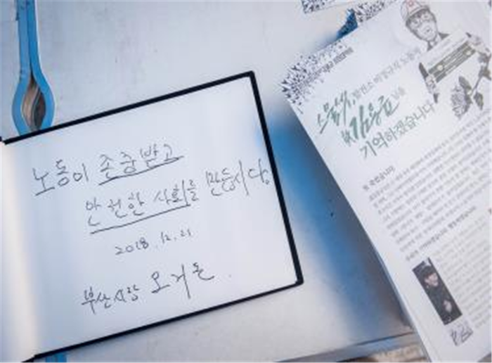 분향을 마친 뒤 오 시장은 방명록에 ‘노동이 존중받고 안전한 사회를 만듭시다’라는 메시지를 남겼다.