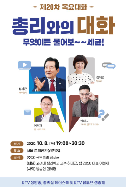 이날 목요대화는 KTV 생방송과 총리실 페이스북, KTV유튜브로 생방송될 예정이다.