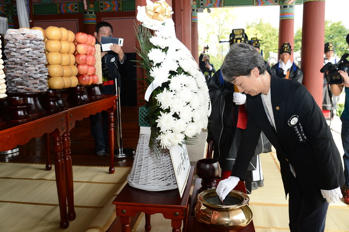 ▲26일 오후 전북 남원시 만인의총에서 열린 제422주년 '순의제향(殉義祭享)' 행사에서 정재숙 문화재청장이 대통령 명의로 헌화를하고 분향을 하고 있다.(남원시 제공) |