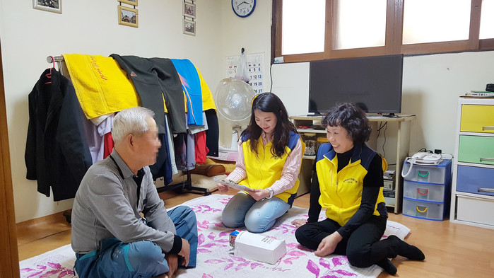 | ▲정자2동 지역사회보장협의체 위원들이 한 어르신 가정을 방문해 상담 하고 있다.(수원시 제공) |