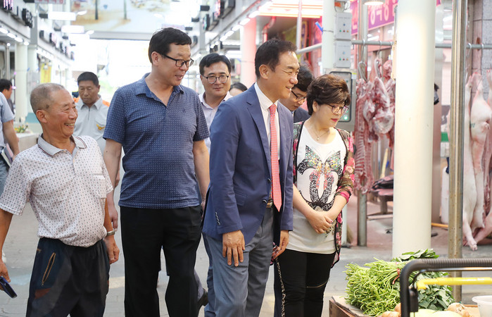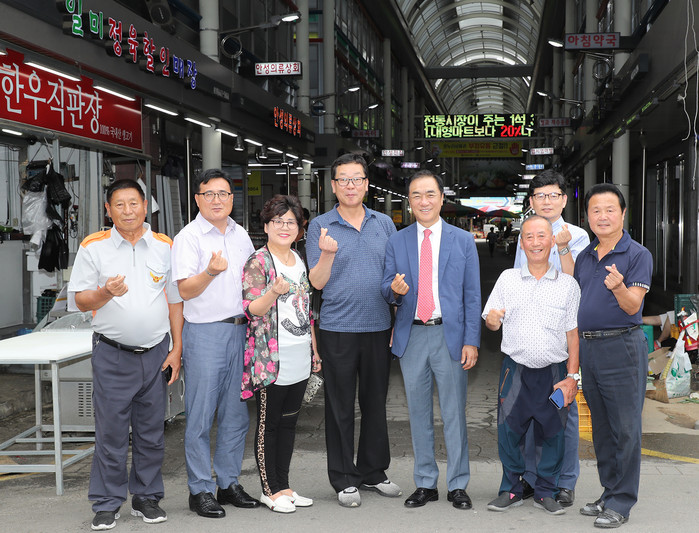또한, 상인회를 찾아 전통시장 개선 방향과 활성화 방안에 대한 의견을 나누고, 상인들의 단합과 시장 환경 개선에 노고가 많은 김진수 상인회장을 비롯한 임원진들을 격려했다.
