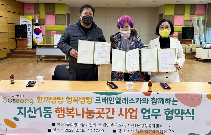 [로컬세계 박세환 기자]대구 수성구 지산1동 행정복지센터(동장 정계순)는 지난 16일 르배인알래스카(대표 이희림)및 지산1동희망나눔위원회(위원장 서신교)와 '한끼빵빵, 행복빵빵' 행복나눔곳간 운영을 위한 협약식을 개최했다.